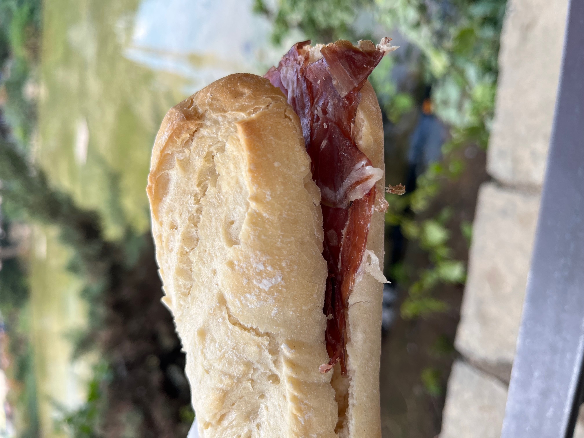 イベリコ豚の生ハムがぎっしりつまったボカディージョを、サグラダ・ファミリアの絶景を見ながらパクリ。