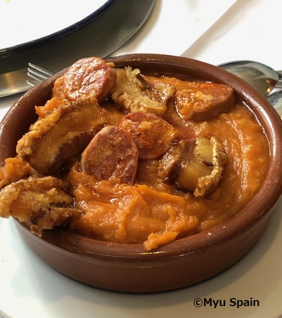 パタタス・レボルコナス (PATATAS REVOLCONAS)マッシュポテトにパプリカ、主にエストレマドゥーラ州のベラ地域でとれたパプリカ Pimentón de la Vera で色付けそこにトレンソと呼ばれる揚げたベーコン加えて食べる品チョリソ(腸詰めソーセージ)も入っていることもありこの頃は、余りバルで見かけなくなったのが残念 (涙)