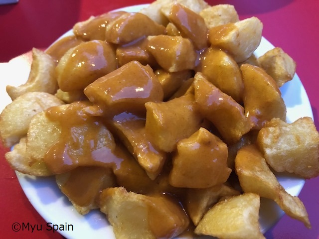 パタタス・ブラバス(PATATAS BRAVAS)ピリ辛の「ブラバソース」がフライドポテトに乗ってる品バルの定番タパスの一つあの辛さがビールを進めます
