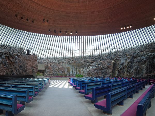 ヘルシンキを訪れるなら絶対に外せないスポット、「テンペリアウキオ教会」に訪れます。別名「岩の教会」として知られるこの聖堂は、巨大な天然岩をくり抜いて造られた唯一無二の北欧建築。天井と岩壁の間に配置された180枚の天窓から差し込む光が、時間帯によって表情を変える幻想的な空間を演出します。