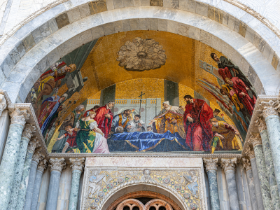 サン・マルコ寺院の外観でまず目に入るのは、ファサードに描かれている美しいモザイク画。素晴らしいビザンティン様式の建物と共にご覧ください。ガイドの解説と共にヴェネチアのシンボルをご堪能ください。