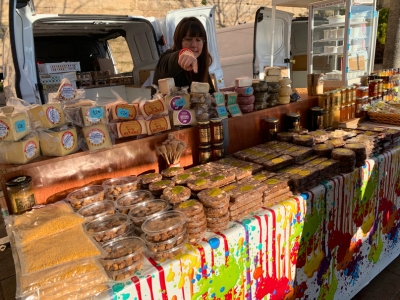 修道院の周辺には地元の農家が出している屋台が並んでいます。はちみつやカタルーニャ名物のフレッシュチーズ 「mató(マト)」、手作りチーズケーキなどを試食したり購入することができます。