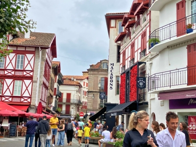 サン・ジャン・ド・リュズはルイ14世が結婚式を挙げた教会が残る港町。可愛らしい町並みを歩きながら、バスク織、マカロンや魚介の缶詰などお土産探しにも最適です。