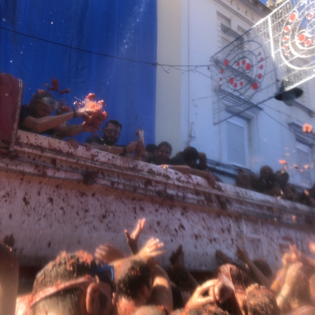 最初のハムを取るために木登りするイベントがあるのですが、挑戦することができてよかったです。欧米人の女性がファイトしていたのを見たのですが改めて文化の違いを目の当たりにしました。誰もハムまでたどり着くことができず、時間になりトマト祭りが開催されました。あんな人混みにどうやってトラックが来るのだろうと思っていたら突っ込んできてびっくりしましたね。それからはトマトにまみれる非日常を楽しむことができました。今回このツアーを利用して安心感は満点でした。ただシャワーの場所が意外とよくわからなく複数把握してくれたらよかったのかもしれません。時間間に合うかなーって不安になる時がありました。