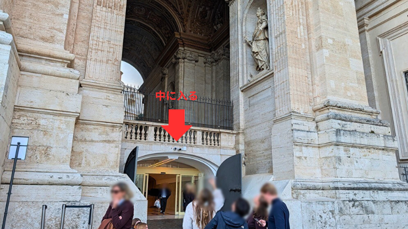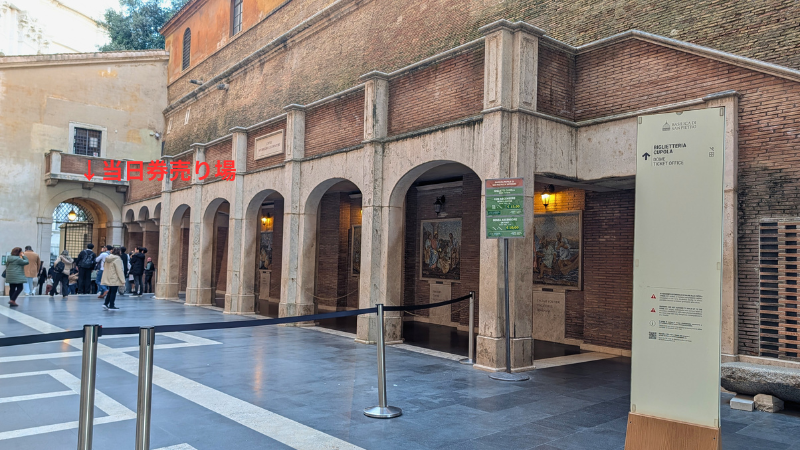 当日券で入場した方は、エレベーターや階段で上った先にあるテラスとクーポラ内部のモザイクエリアを抜けて、展望エリアへの入口の先、USCITA(出口)方面に進んだテラスです(後戻り可)[みゅう]のツアーでは、「サンピエトロ大聖堂入場付プラン」にご参加のお客様のみをヴァチカン美術館のシスティーナ礼拝堂から通り抜け通路を通ってサンピエトロ大聖堂入口までご案内いたします。